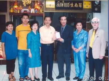 图为文杰宗亲乐助总会会务活动经费10万泰铢时合影。左四起: 文杰宗亲,道楼理事长,法律顾问兼公关主任明杰,副理事长瑞珍。左三至左一为文杰宗亲夫人及子女。
