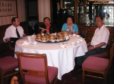 中午,道楼理事长、顺海副理事长在曼谷著名的"汉宫楼"餐厅设午宴款待健清宗亲偕夫人罗萧旅紫女士。席间,宾主互相介绍美国和泰国经济文化交流及华人社团和罗氏宗亲发展盛况,并以酒代茶,举杯互祝康泰祺祥,万事如意,事业兴旺!午宴气氛温馨,宗谊敦厚,亲情融融。道楼理事长获知美国也有罗氏宗亲会时,异常高兴,拜托健清宗亲返回美国后代为沟通联络,以便与美国罗氏宗亲社团建立长期稳定的联系,开展交流联谊,共谋发展。