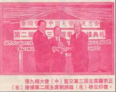 泰国若干华人社团也纷纷在新闻媒体刊登广告和中华人民共和国驻泰王国特命全权大使张九桓阁下出席“泰国留学中国大学校友总会”第二届、第三理事会交接典礼的大幅照片,表示热烈祝贺!