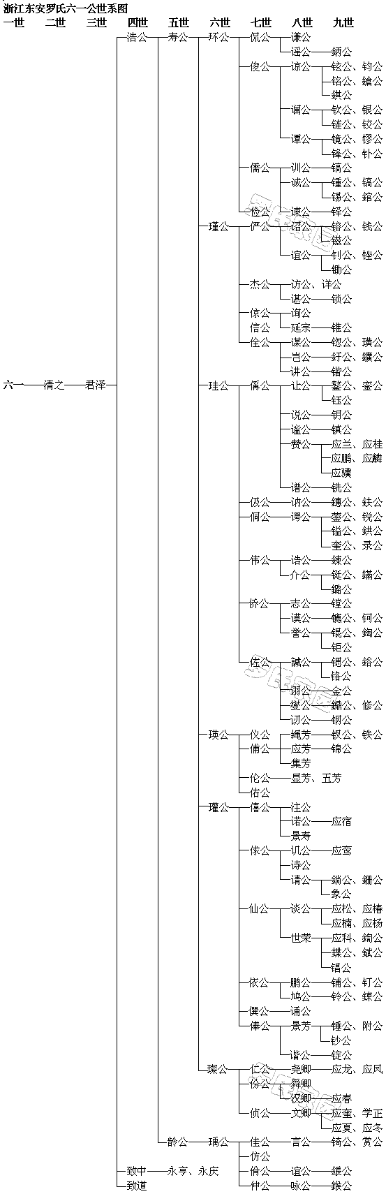 瓘,寿公五子。行六,子廷采。生宣德中年,卒年未详。娶袁村邱氏,生卒未详,合葬後山。子六:僖、俅、仙、依、僎、俸。女一:适永昌王玺。开老五房。