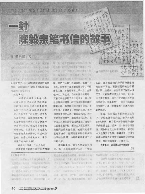 现将武汉理工大学韩秀成先生原文及陈毅同志书信影印件分录于后,以供参阅。