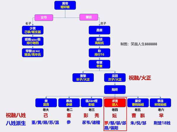 吴回生了个儿子叫陆终,陆终娶了鬼方氏部落名叫女嬇kuì的女子,传说怀孕3年都没生出来,最后不得不剖腹,结果左边剖出3个儿子,右边剖出3个儿子,一共6个儿子,老大樊(昆吾)、老二惠连(参吾)、老三篯jiān铿(彭祖)、老四求言(会人)、老五晏安、老六季连,这六个儿子后来派生出8个姓氏:已、董、彭、秃、妘、曹、斟、芈,史称祝融八姓。其实在这八姓基础上,又派生出了更多的姓,远不止八姓。