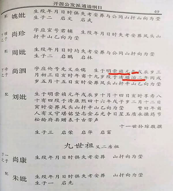 六、尚泗生于崇祯元年1628,卒于顺治元年1644,17岁就有三个儿子:启荣、启华、启富。17岁就有了三个儿子,不太可能。不考虑配氏,14周岁发育成熟;10月怀胎产后满月即又怀孕;连续3年如此;每一胎必须是男丁。四个条件缺一不可。(见图片六)