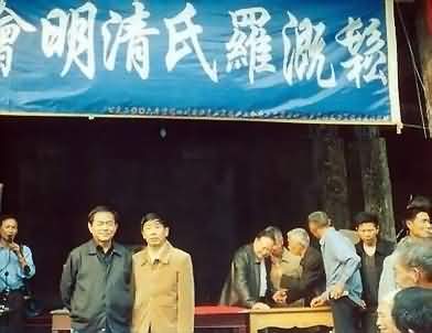 在松溉的古建筑中,以位于松子山街22号的罗家祠堂最为有名。《松溉罗氏族谱》(清“嘉庆”丁巳年木刻本)记载:入蜀第六罗世勋于清“乾隆”己丑(1769)年起,在松溉镇松子山前(金子山后)修建本氏宗祠,起竣三春,冠名为“世德堂”。至于为何取名“世德堂”现已不可考,但后来永川出了个嘉庆庚午举人、辛未年三甲第5 9名进士也叫罗世德,字玉成的,我们不知道他的族属情况,或许是因此祠堂而得名的吧。[图为《罗氏通谱》顾问罗迎难(左)与笔者在罗府祠堂的清明会上]