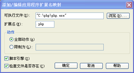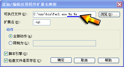 推荐"c:\usr\bin\perl.exe" 记得一定要在后面加上" %s %s " ,不然没法执行cgi的,确定后。用同样的方法添加扩展?br /> ?pl,如图: