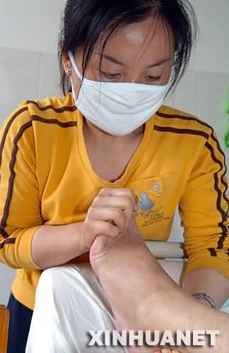 5月31日,罗映珍在医院照顾丈夫罗金勇。新华社记者 王长山 摄