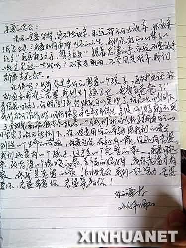 ……“记得谈恋爱时,说实话,我并没有投入太多感情;结婚后,我们的爱才真正开始,而且越来越好。如今我更爱躺在病床上的你,因为你是我的选择,既然选定了就要真正投入,就要负责任。而你从来没有给我写过一封情书,也很少给我发短信。现在我每天都给你写情书,为你用心做每件事。还为你种了两株万年青,我希望你的生命之树长青。老公,不要让我失望,快点好起来吧。”(罗映珍日记,2005年11月2日)