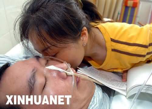 5月10日,罗映珍在病房中贴近丈夫罗金勇的耳朵说话。新华社记者王长山摄