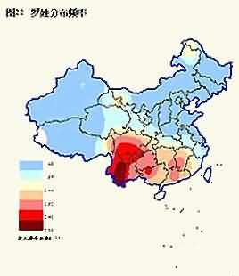 ● 罗姓的当今分布 当代罗姓的人口已达1020万,为全国第22位大姓,大约占全国人口的0.81%。从明朝至今600年中罗姓人口由70万激增到1020余万,达15倍之多。明朝的平均人口接近9300万,当代的人口按13亿计,人口增长了14倍。罗姓人口的增加速度高于全国人口的增加速度,1000年罗姓人口增加率是呈上升的态势。在全国的分布主要集中于四川、广东、湖南三省,大约占罗姓总人口的41%,其次分布于江西、云南、贵州、湖北、广西、重庆,这六省又集中了41%。四川居住了罗姓总人口的17%,为罗姓第一大省,占省总人口的2.1%。全国形成了云贵川渝粤湘闽赣鄂高比率的罗姓区域。在近600年间,罗姓人口流动的程度和方向与宋、元、明期间有了很大的区别,流动方向由东部向华中、华北的回迁已经大于由北向南和东南的迁移,向西、向南的移民成为主流,同时也出现了向西北河西走廊的流动。 罗姓分布很广,但不均衡。罗姓在人群中分布频率示意图(见图)表明:罗姓在长江上中游以南地区是比较常见的姓氏之一。罗姓在云南、贵州、四川大部、广西西部、广东北部、湖南东南、江西西南等地区,一般占当地人口的比例达最高,在2%以上,尤其在云南南部,有的达到3%,这部分高比例的地区的覆盖面积约占了全国总面积的11.5%;广东大部、广西大部、海南、福建大部、江西大部、湖南大部、四川北部、重庆、湖北南部、甘肃中西部,罗姓频率在1-2%之间,其覆盖面积约占了全国总面积的15.6%;台湾、浙江大部、安徽南部、湖北北部、河南东南角、陕西南部、甘肃南部和西部、宁夏南部、青海东部,罗姓频率在0.5-1%之间,其覆盖面积约占了全国总面积的13.5%;罗姓在其他地区的频率不足0.5%,其覆盖面积约占了全国总面积的59.4%。
