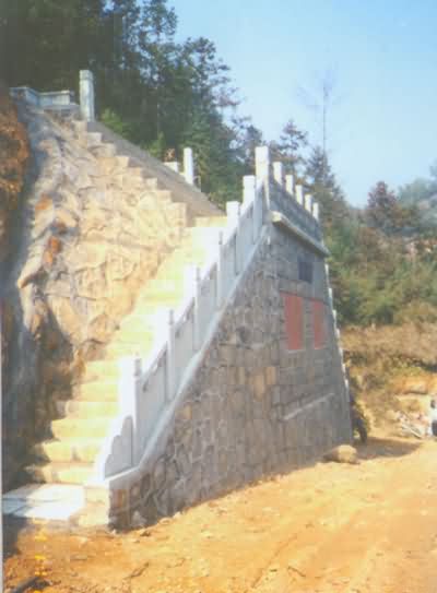(3)从休息平台到祭拜平台,拾级而上是9个台阶,一个台阶表示10岁。珠公寿91岁,另砌一寸台阶表示一岁。