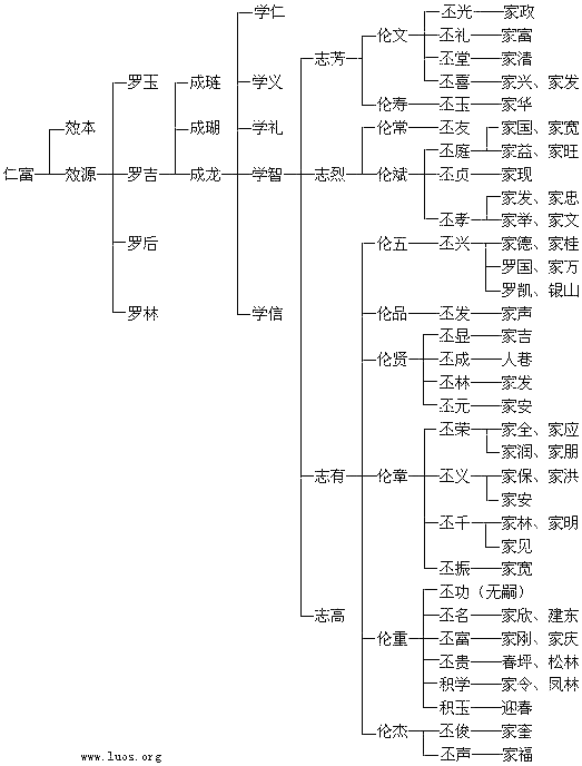 基本概况 由于本系所存老谱在中华人民共和国成立后不久因房屋起火被焚,因此无法列出迁入四川前的列祖列宗。据仅存的两处族谱手抄本(摘要)和入蜀一世仁富公的碑文记载:“鼻祖原籍江西省吉安府吉水县烈龙村”,“本源溯自豫章”。属豫章罗氏江西吉水秀川崱公支系。 先世祖“于洪武丁巳年(即洪武十年,1378年)迁居湖广省常德府武陵县石拱桥罗家祠堂一带居住”,后因“湖广填四川”(大移民),仁富公“于康熙庚寅年(即康熙四十九年,1710年)十月内动身至辛卯年正月初八进入四川省奉节县,继而又上云阳、万县,而后复返奉节”,落业于奉节县青正乡红石梁。其子孙分布于奉节县的朱衣、公平、竹园、永安等乡镇。云阳县、万州区、陕西省的镇坪县、湖北省的房县也有本系子孙。至于入蜀的详细分支与人口情况,因老谱被焚,无法统计。 1986年正月,奉节公平区族人代表借祭祖扫墓时推选仁富公第八世孙罗积厚续修族谱。历时一年多,油印出125本小册子分发给本系各地族人;除桂坝支系外,未列出各地世系图。只是将已确知的源流和增叙的字派及有关碑文载入支谱。现将续修的仁富公世系的班辈列后(先前三十世,增序七十世): 希国仁效列,成学志(丕)丕纲,(家声)忠世清同广,庭华居立康 克继先道安,良从传千乡,增序展宏图,雄才朋满堂, 位高善纳谏,定保祖德扬,俊杰博书文,永远长富强, 本朴全敦厚,明哲爱兴创,功泽美雅典,群豪久辉煌, 举族祝和平,隆茂耀天朗,百炼丹益纯,政教旺豫章。 注:1,希、国两代先上四川,因社会动乱,又回原籍;2,列字派为单派,纲字派为倒派;3,丕、家、声三代分别与纲、忠、世三代同辈。