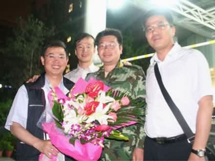 华为公司GTS总裁李杰、人力资源管理部副部长童国栋、成都办代表陈忠、后勤保障人员等四川移动抢通指挥中心人员迎接罗涛归来,献上鲜花欢迎他,平安归来。