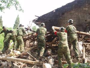 5月15日下午14时,罗上力、罗上兵兄弟随宜宾县民兵应急连125名民兵就到达了绵阳市安县桑枣镇展开了救援工作。桑枣镇位于绵阳以西五十公里,11000多户,19个村,1个社区,33600人,地震后,房屋受损100%,垮塌50%,死亡98人,失踪27人,受伤5000余人,缺水、断电,通讯中断,受灾较为严重。 “看到的比想象中要严重,房屋变成了废墟,伤亡很惨重,大家都很悲伤,但更增加我们投入救灾的信心和勇气,尤其罗上力两兄弟更是积极抢工作任务,总是走在救灾第一线,是我们民兵的典范。”宜宾县应急连三排7班班长翁玉权描述起刚到灾区时的情景。宜宾县应急民兵连到安县后,面临诸多困难,生活非常艰苦,没有水,无法漱口、洗澡,天气炎热和余震不断,每天往返救援地与驻地近两小时,超强度、超负荷进入废墟为受灾群众抢救粮食和衣物。 “还是担心危险,25号我们就吓到一次,幸好大家都没事。”罗上力很平静地对笔者说。据了解,5月25日发生6.4级余震时,罗上力兄弟和战友们正在桑枣镇红牌村一农户的房子中抢运粮食和贵重物品,本来房子在特大地震中已经摇摇欲坠了,但他们还是冒着生命危险抢救出近6000斤粮食和价值上万元的物品,为灾区人民减少了损失,罗上力在这次抢救粮食中受了皮外伤。 “什么事情使你最感动?”笔者问。 “那是我们帮受灾群众抢救出粮食后,他们不断地感谢我们时。”罗上力浸着眼泪对笔者说,“为受灾群众减少损失感到欣慰,也为自己毅然选择来灾区救援高兴。” 从5月15日到现在,宜宾县民兵应急连一直连续奋战在抗战救灾的一线,据粗略统计他们为灾区群众抢收粮食500多吨,转运价值上千万元的捐赠物资,罗上力兄弟所在的7班为受灾群众抢收粮食30多吨,足迹遍布桑枣镇12个村,他们的事迹得到《中国军网》等媒体的广泛关注和宣传,罗上力、罗上兵兄弟俩也真实演绎了现实版“兄弟连”。目前,他们两兄弟仍和宜宾县民兵应急连的其他民兵一道积极为灾区人民抢救物资、帮助灾区人民重建家园。 (《宜宾公众网》2008年06月01日) |