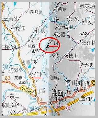 我家的家谱上记有“元武宗已酉(1301)年八公南游湖广宝庆传四世,子荣公另立一户”,记有“明洪武乙卯(1375)年子荣公在湖广东路八都石门冲修甲申载税粮48石(dan)于石门”,还有“清康熙庚午(1690)年仁清公百余人奉旨填川时仍留在原籍的仁开、仁田、仁才等数十人的情况”。时过300余年的今日,先辈们活动过的“湖广宝庆、石门冲、长烟铺、木梁(蒲家)、红叶树下、老云里、严冲、井弦、桃义湾、塘弦、努箭山、黄土印、石下山、周背山、古塘、陡岭、下长山、黄泥井、楼下山、老芽垪”等地域在哪里?这些地方现在叫什么名?带着这些问题,我在网上点击了湖南省邵阳地图和隆回地图。首先在邵阳市看到隆回县有两个石门,如下图(石门乡行政区域图):