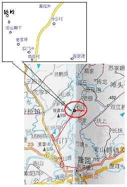 经细心反复缩放,谱上的多数地名及周围地区都能找到,经测定距离,最后下载、复制、合成了所需的石门乡及石门冲附近村落图组: