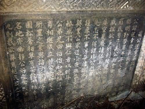 走进罗氏碑屋。这是一个小院子里的堂屋,四周分别晾着干玉米、堆放着柴禾等物。在堂屋正中,赫然立着一块石碑,让人觉得心里发寒。该墓碑高约4米、宽5米,上面刻满了密密麻麻的小字,经仔细辨认,是《罗氏运章墓志铭》。石碑上还有人物刻画和镂空的金钱图案,最醒目的是一副对联,上联是“死者可作言坊行表”,下联是“先生之风山高水长”,横批“遗爱堂”。碑后另一块墓碑阴刻着“罗公运章、罗母杜君寿藏”字样,其后便是坟墓。墓志铭中的一段文字:“家园周围,松苍柏翠,有茶树数十株,香清可人……地亦幽静,公(罗运章)好之,常歌曰乐哉……则我欲葬焉。”道出了此墓的来由。