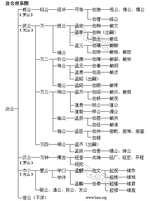 一,豫南罗氏 1,汝公世系 罗汝,字文宽,号海涵,珠公第四十世孙,祖籍江西吉安府吉水县竹溪村。原配何氏,继配胡氏、李氏。公“荫袭武略”,至正元年(1333)与弟罗渭同时进举。授举人教习,又授江宁府高淳县令,奔赴抚州,于至正八年(1341)擢升镇南总管大将军。 时值元末战乱,罗汝恪尽职守,与佐相总帅李甫率领元军同洪武部下徐寿辉、陈友谅大小百余战,元军伤亡惨重,钱尽粮绝,汝公与三位夫人同时战死沙场。 公幸存五子:长曰威,次曰武,三曰汉,四曰杰,五曰宿,他们隐姓埋名,易姓为刘。洪武八年(1376)大赦天下,汝公五子始得复姓真名。分别由江西九江、帆渡、湖广、麻城、黄州迁徙豫南罗山县、光山县、信阳县、息县、固始、正阳、汝南等地、市落籍。