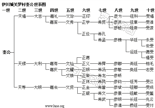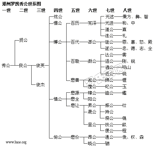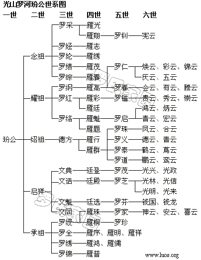 河南地处中原,不仅是罗氏得姓之前的先民们的主要活动区域之一,而在南北朝、隋唐间即有罗氏事业成功的记载,“君讳端,字文静,洛州洛阳人也”(罗端墓志铭),即为李世民之大将、翊卫大督、神羽将军。今逢盛世,世代以忠为本,耕读为业,礼义传家,清白自守,心怀天下的河南罗氏,必将弘扬光大罗氏家风,创造出更加灿烂辉煌的罗氏文化。 (世系图为罗良富根据《中华罗氏通谱》绘制)