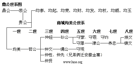 2,鼎公世系 鼎公,珠公五十一世孙,祖籍江西南昌柏林沟,洪武二年,公游学至吉安府吉水,后徙湖广、麻城邑南乡白果畈五里许居住。公子一:恭公。恭公子一,贵公。贵公子九:均美、均泰、均起、均荣、均财、均发、均权、均顺、均玉。长房均美公,迁豫南于大别山脚下的商城、固始定居至今。明朝中叶均美公四世孙阶公生五子:长曰守豪、次曰守厚、三曰守恩、四曰守约、五曰守观。守厚、守观留守商城,其余三子播迁安徽省金寨县等地。