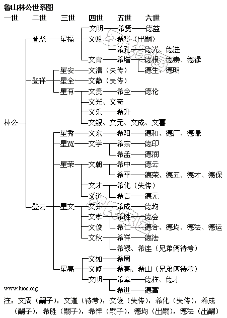 11,林公世系 林公祖籍山西洪洞大槐树,明清之交战乱,逃至河南鲁山北西观音乡就居,繁衍生息,数年后传九世孙国政追记林公为开基祖。发展达数千人,播迁新、皖、湘,实属名门旺族。