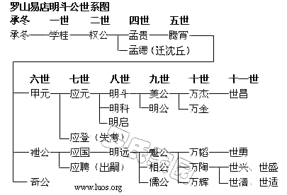 3,明斗公世系 企生公十三世孙百忍公于元顺帝科赠武举人,任道台。嗣下四子:长曰承春,故南昌筷子巷,次曰承夏,三曰秋,四曰承冬。夏、秋、冬兄弟三人由江西南昌徙湖广汉阳府黄陂县毛清河,后再徙西城罗汉寺,以经商为业,繁衍数世。公八世孙明斗公后裔先后北迁豫南罗山县易店、朱堂,还有确山、沈丘等地,改以农耕为主。以明斗公为开基祖。