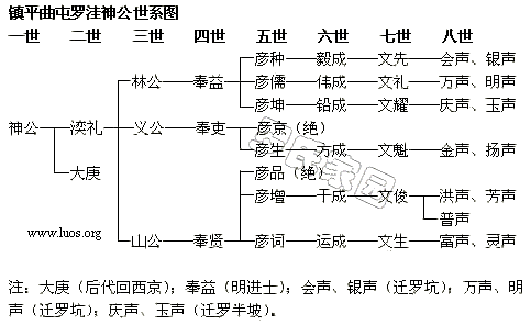 8,神公世系 神公,原籍山西洪洞县,明洪武初年,因战乱而携湙礼、大庚二子徙河南镇子曲屯乡落业,耕读生存。公十一世孙万象为太学生(乾隆老师);二十一世孙罗国杰教授,任中国人民大学副校长。