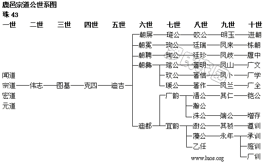 三,黄淮罗氏 1,闻道、宗道、宏道、元道公世系 元末明初,战乱殃及百姓,流离失所,长门文道祖、次们宗道祖、三门宏道祖、四门元道祖由江西临川县逃至山西洪洞栖身歇脚,后又南逃豫中黄淮平原的鹿邑县暂住数年,各立其所。长门闻道迁至扶沟县、西华县、许昌市等地;次门宗道定居鹿邑罗楼村,其后裔有播迁商丘等地;三门洪道祖迁郸城、项城等地落籍;四门远道祖守鹿邑罗氏姻(姑)堆、淮阳等县。