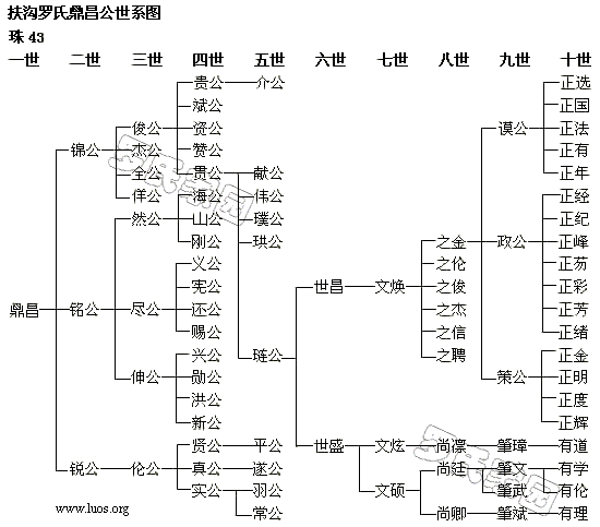 2,鼎昌公世系 鼎昌公,珠公后四十一世孙,字志盛,号浒田。明太祖都南京,以孝廉方正任永平府司狱。任职数年后,将家定居北方迁居中原扶沟范姜村(改罗沟村)。后裔发展播迁许昌、开封、尉氏县等地。