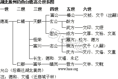 3,德高公世系 德高公,原籍江西余干县,永乐二年(1404)与允一公率家迁湖北麻城白果,二世祖仁辅、仁乡转徙黄岗邾城,即今之新洲官天畈罗家套一带。三世祖天麟公复转至西冯乡(今方杨乡)钓鱼台。德高后裔遍及苏、皖、川、陕、赣等十余省四十余县市。共繁衍二十三世,一万二千余人口,实乃旺族。