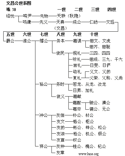 按:唐朝末年,江西南昌柏林罗氏文昌偕堂兄秋隐至呈坎以避乱世,文昌公定居于呈坎盆地的东南部(称上溪东、下溪东),为前罗族始祖;秋隐公定居于盆地的西部(称后岗),为后罗族始祖。故呈坎罗氏有“前罗”、“后罗”之谓。又:前罗世系文、图资料来源不一,如不吻合,智者正之。后罗亦然。