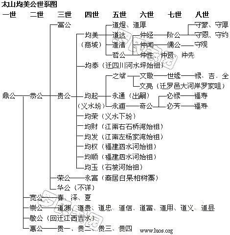 均美公曾祖鼎公,为珠公五十世孙,原籍江西南昌柏树沟,初迁江西吉安吉水县溪下镇,明洪武初年再迁湖北麻邑白杲西北五里许赤山咀唐家巷(柏树寨),为西陵始祖。生五子:恭、宽、崇、敏、惠。恭生四子:富、贵、荣、华。贵公生均美,由湖北柏树寨迁安徽太山,为迁居一世开基祖。生九子,裔迁商南、四川、鄂省义水、江南、福建石坡河等地。
