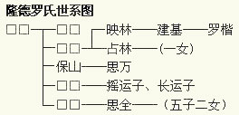 隆德罗氏世系 隆德县原属甘肃平凉,1958年改隶宁夏固原。 隆德城关王兴湾村罗氏原籍山西,据老一辈人传言,祖上是从山西(一说从洪洞大槐树,一说从晋国或晋城)搬迁到甘肃庄浪罗家的,时间大概是明朝或者更早。罗氏家族在当时当地可谓是大户,但不知因为什么缘故(有传言是因错而发配)从山西往外搬。离开山西时,有四支亲房,一支去了东北,一支去了湖南,一支来了宁夏,还有一支去了福建一带。 民国十九年(公元1930年),太(曾)祖父祖母带着五个儿子,从甘肃庄浪罗家老庄举家迁往现宁夏隆德县城关王兴湾村。 大房祖、妣失考。 二房祖、妣名讳及生卒年失考。生有两子,长子讳占林,小字喜子,行武出身,多年当兵在外,后下落不明。单传一女,小字曼子;次子讳映林,小字根子,从小离家,寄身军旅,曾参加过台儿庄战役,后于1941年2月间,为逃避兵役,离开冯玉祥将军的部队,未回故土老庄罗家,只身落户于隆德县城关乡王兴湾村,娶妻郭氏芝兰,衍生一脉新枝。一子名建基,建基生一子名楷。 三房祖保山、妣黎月珍,生一男三女,子名思万,小字掌家子。 四房祖、妣名讳及生卒年失考。据传说四祖中年即下落不明,妣母后于今固原和尚铺出家。生有二男,长子小字摇运子,次子长运子,学名不详。 五房祖、妣名讳及生卒年失考。传说人称罗老五,客卒于平凉鸡毛洞。单传一子,名思全,小字牛来。思全生五子二女。