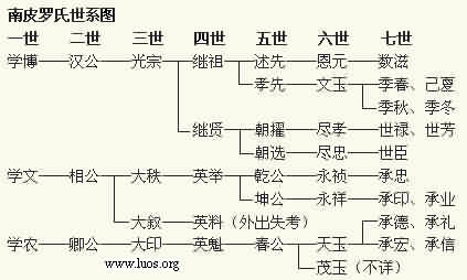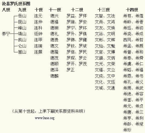 二,沧县罗氏世系 沧县罗氏豫章支,一世祖于永乐二年由山西迁入沧州韩家庄,因战乱而祖谱丢失,致一至七世祖名讳不详。八世祖于神宗年间由韩家庄迁入自来屯(原李明庄),繁衍生发至今,已超过5000人丁。 沿袭字派:宇山连德单,文希亭元永,毓长兆国庆,广明发吉祥,春普瑞金贵,青相义仁家。