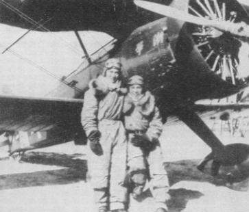 入笕桥学飞行后,我和周竹君编在一个飞行小组(每一个飞行小组有七名飞行生)教官为邢铲非,罗英德编在另一小组,教官为王叔铭,这两位教官带我们飞行仅三个月,即调升为战斗部队长,此时有些同举已被淘汰,两组剩下的只有七个人,学校将我们两个小组合并为一组,由刘超然教官教飞,此后我们飞行在一起、上课在一起,直至中级飞行结业。高级飞行时,我被分配到侦察组,他则分配到驱逐组,从此各专所学,在一起的时间就很少了。当我们同小组飞行时,常常听敬官夸奖他机警、敏捷,接受力强,飞行天分高,将来可以做一位好驱逐战斗员,果然不出教官所料,他果然成为最优异的空中战斗员。(左上图:本文作者[左]与罗英德将军于霍克II机前合影)