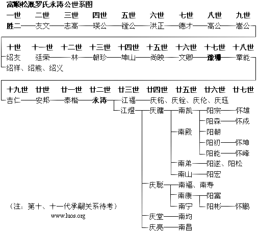 作者:罗阳能http://www.luos.org 据富顺罗阳能留言提供的资料,富顺罗氏豫珊……永涛公支系,为永川松溉罗氏胜二……志高系的分枝,亦从第十七世豫珊公起,袭用统一字派: