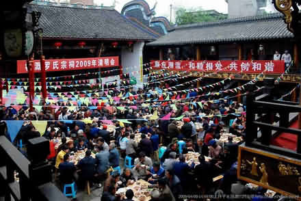 2009年4月4日,几千罗氏子孙的代表从全国各地赶到重庆市永川区松溉古镇,远道而来的基本上前一两天就到达了。熙熙攘攘的人群聚集在古镇里著名的罗氏会馆,准备参加传统的祭祀活动。早上八点,举着特定祭祀寓意的各式旗幡和代表各房各支标牌的祭祖队伍,敲锣打鼓,从古镇出发,前往三公里外的打鱼河村金龟洞祭拜落业松溉的始祖。徒步一个多小时到达祖坟前,在鞭炮声中,祭品摆上香案,点燃香蜡纸烛,长者吟唱祭文,各房各支的罗氏族人代表则依次近前拜祭先祖。仪式结束后,大家又回到罗氏会馆,此时的会馆院坝里已经摆起了上百张桌子。12点整,松溉特有的“九大碗”流水席正式开席了。所谓 “流水席”就是几十桌为一轮,一轮吃完再摆一轮;“九大碗”则是每桌的菜品除了几个凉菜外全是蒸菜,包括整只的鸡、鸭、鱼及川渝地区特有的烧白、粉蒸肉、扣肉等共九道,所有的菜品全靠厨房里四座近三米高,直径一米的特大号蒸笼一次蒸好,再由几十个帮工依次端上桌席。罗氏家族清明会筹备组负责人表示,办家族宴的宗旨除了祭拜先祖,主要还起到增进族人相互之间的团结、友谊、互助、和谐的目的。