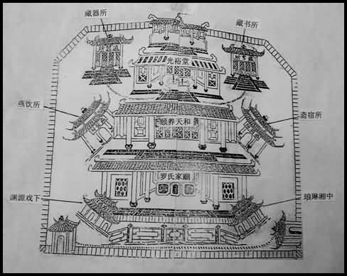 (鼠标指向看大图,点击看新图) 说明: 一、湖南茶陵秀川罗氏《光裕堂》原址在茶陵县城西关七总街,即:如今的茶陵一中教学大楼处。 图中:1、藏器所;2、燕饮所;3、渊源戏下(即熂下);4、光裕堂(礼部尚书湛若水题词);5、颐养天和(兵部尚书于谦题词);6、罗氏家庙;7、藏书所;8、斋宿所;9、琅琳湘中。 二、光裕堂总联: