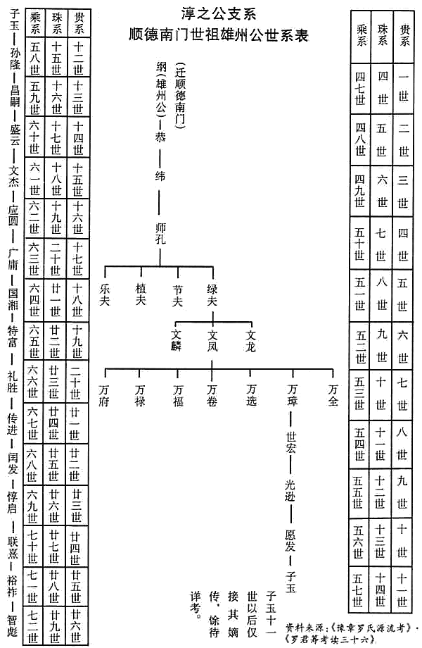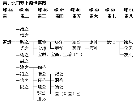 根据曾昭璇教授《宋珠玑巷罗贵家南迁记》综合考证,北门罗始祖德凤公,为罗贵公第三子辉之公之裔,为珠系51世;南门罗始祖雄州公,为罗贵公第七子淳之公之裔,为珠系47世,且与现存一些传说基本吻合。整理如下,以为对应。