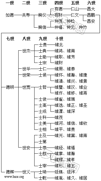 家之有谱,犹木之有本,水之有源,虽别派枝分,其宾则归于一,倘无是谱,则世代无稽,亲疏莫辨,尊卑颠倒,昭穆混淆,正如观水不知其源,观木不知其本,呜乎!可我们没有把全国豫章郡的人氏统一起来的本领,只好就近地同宗代表所建议的统一行第意见来决定。这次统一行第的主要标准是查阅各地罗姓谱序,有组织的、有系统的谱序根据来确定统一行第标准。通过全面地查阅家谱后,各地同宗代表一致认为如德公派下家谱较有世世代代、连续不断之完整家谱谱序的根据,以此统一行第,号名造谱,其各地的旧的行第均告不用,一律作废。今后各地罗家,世世代代子孙很快地兴旺起来,发展到继字辈之时,再续编制行第,若有希望、可能条件,各地同宗的后裔代表者,必须统一修造宗谱,亦要统一编订行第,不能非为乱作。