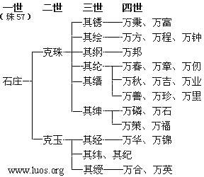 二世(珠58) 克珠,石庄公长子,生于嘉庆年间,妣刘氏,生六子:其锈、其绘、其纲、其纶、其缙、其绅。珠公卒与玉公同葬东叶山下穴坐庚向甲兼酉卯分金,灰坟石碑绘有图,刘氏妣母附葬姑墓。 克玉,石庄公次子,生于嘉庆年间,妣何氏,生四子:其经、其纬、其纪、其绶。