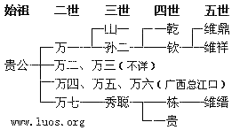 作者:广发湛江 罗擎宇http://www.luos.org 廉江竹寨族罗氏,郡望豫章,上源世系待考。始祖贵公(按:与珠玑巷罗贵同名),原居福建汀州莆田县瓦子坑村。为寻找广东石邑的亲人和长斋祖,于明世宗年间(1521~1566)到达竹寨开基创业。妣蓝氏,生七子:万一、万二、万三、万四、万五、万六、万七。四、五、六房迁居广西总江口,以船夫为活,后上岸拓业。一、二、三、七房在原居地竹寨拓业传芳,致成竹寨罗氏一族。繁衍至今,已发二十一世,二千三百多人口。