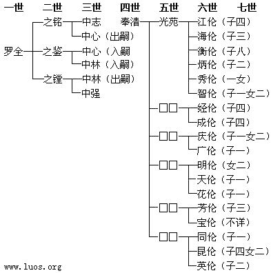 始祖罗全,衍三门(房):长之铭、次之鉴、三之镗。三世分中志、中心、中林、中强四门。四世只知一人名奉清,余失考。五世分六门,只知长门名光苑,余名失考。至六世人丁兴旺,分十八门,为“老十八门”。第七代亦有堂兄弟十八人,为“少十八门”。