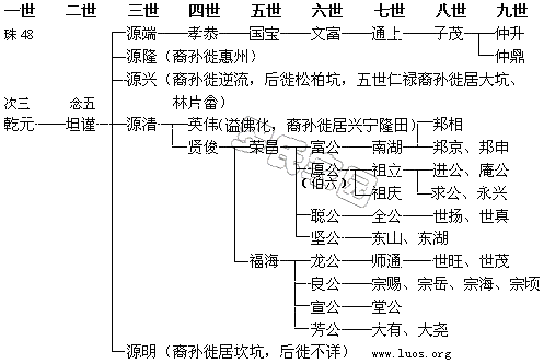 据2000年大埔坎厦乾元公系《罗氏族谱》载,大一公三子次三郎,被奉为迁居大埔坎厦一世始祖。乾元公,生一子念五郎(坦谨公),念五郎生五子:源端、源隆、源兴、源清、源明。
