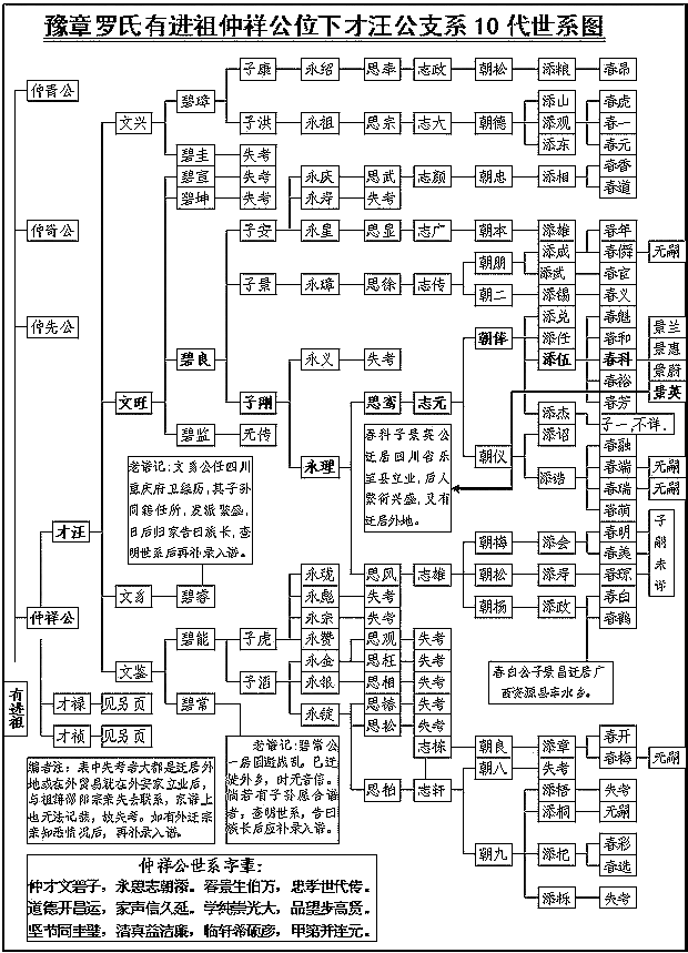 九、有进祖到景英公各代世系文字资料 47 .迁楚始祖:豫章罗氏第47代先祖 本房迁楚始祖:罗公友进,字德修,号茔钦,天佑公四子。由江西吉安泰和县迁居邵陵谭井湾两头塘开基立户。殁葬隆回县岩口乡九龙雷王观(今隆回县岩口乡温里村)。明洪武二年(公元1369年)迁楚南宝庆邵邑城西谭井湾,世系老谱尊其为迁楚一世祖。配俞氏、孙氏,开九大房。 配俞氏,殁葬邵阳西路火烧亭石冲,丁山癸向. 俞妣生四子: 仲祥、仲先、仲奇、仲青。 祥、先两裔居邵阳市江北、长阳铺、枫林铺、石冲、南岗、岭上等处; 奇、青两公裔居隆回温里、大来、龙口、塘头、枫林坪、天子山、鸟树下大屋冲等处。 孙氏生五子,居新化茅田、水车等处。 老谱载:清乾隆、嘉庆年间,多有徙居贵州遵义、湄潭、平坝、四川万州、云南昆明等地。 友进公为迁楚始祖也,四子分祥、先、奇、青四大房,繁衍兴旺。 第47代其它房系情况: 1.友直,讳孟,生二子:大明、大成;大明讳宜高,与弟大成,籍江陵公安刀村开基。 2.友闻,讳叔,号以文,生四子:宜方、大德、宜中、宜仲,分居西路长烟铺;宜方讳实伯,生师旦;大德生子云;宜中生惟立;宜仲生福孙,兄弟籍公安白湖村立籍。 3.友益讳季,生隆仲,其后迁居宝庆府新化风洞水车罗坊等处。 48.迁楚一世祖:豫章罗氏第48代先祖 仲祥,字吉甫,友进长子。殁葬生于湖广省宝庆府邵邑城西谭井湾,巳山亥向。配谭氏,葬湖广省宝庆府邵阳县邵邑城西梅冲,乙山辛向,子二:才禄、才旺。 友进公为迁楚一代人的始祖也,四子分祥、先、奇、青四大房,繁衍兴旺。各房新排字辈班次后,各房后人在家谱中都称仲祥、先、奇、青公为为本房迁楚后的第一代世祖也,以后按此序号排序。 第48代其它房系情况: 1.仲先房:仲先,号魁甫,友进次子。配李氏,夫妇生殁失考,合葬两头塘。子五:才福、才库、才晋、才政、才兴。 2.仲奇房:仲奇,字子奇,号瑞甫,友进三子。殁葬上边山。配丁氏,葬下梅冲。子三:邦志、邦用、邦庆。 3.仲青房:仲青,字介甫,友进四子。居两头铺。生殁失考,葬屋背后。配邓氏;副配李氏,俱附葬夫冢。子四:邦德、邦旺、邦受、邦衡。邦庆字吉昌,配黎氏,生子必聪。 4.友进公副妣孙氏,生殁葬失考,生五子失讳,居新化茅田、水车诸地。还需要考证补充。 49.迁楚二世祖:豫章罗氏第49代先祖 才旺公,仲祥次子,字昌后,生卒年月不详;立户永成二都二甲,葬谭井湾,已山亥向。祖妣卢氏,生卒年月不详,葬井底屋后,辰山戌向;子四:文兴、文豸、文汪、文鉴。 第49代其它房系情况: 才禄公,字名爵, 生卒年月不详;葬谭井湾,已山亥向。祖妣黄氏,生卒年月不详;葬谭井湾,异山乾向;子:文华、文踏。 文华,字国章,祖妣胡氏,生卒年月不详;同葬谭井湾,异山乾向,子五:碧清、碧政、清通、碧亨、碧庆。 文踏,字豪章,愿名达,因犯祖讳,改名踏。祖妣肖氏,生卒年月不详;同葬谭井湾,异山乾向。子五:碧方、碧兴、清善、碧贵、碧顺。 50.迁楚三世祖:豫章罗氏第50代先祖 罗公文汪,字泽洋,国学生,才旺公三子,生卒年月不详;祖妣刘氏,生卒年月不详;葬井底屋后,辰山戌向;子四:碧宣、碧坤、碧良、碧监。 第50代其它房系情况: 罗公文兴,字化仁,住古塘冲,才旺公长子,生卒年月不详;生于湖广省宝庆府邵阳县孝感乡井地村。祖妣唐氏,生卒年月不详;继妣蒋氏,生卒年月不详;同葬谭井湾,子二:碧璋、碧圭。 罗公文豸,才旺公次子,字豹变,住潘冲,岁贡生,生卒年月不详;任四川重庆府卫经历。祖妣陈氏,生、没、葬不详;子一:碧睿。 老谱记:其子孙同籍任所,发派繁盛,日后归家告曰族长,查明世系后再补录入谱。 罗公文鉴,字皎如,才旺公四子,恩贡生,任府昭历,葬井底屋后,辰山戌向。祖妣李氏,生卒年月不详,葬会子冲。子二:碧能、碧常。老谱记:碧常公一房因避战乱,已迁徙外乡,时无音信。倘若有子孙愿合谱者,查明世系,告曰族长后应补录入谱。 51.迁楚四世祖:豫章罗氏第51代先祖 第四世祖:罗公碧良,字白珩,文汪公三子,生卒年月不详;祖妣刘氏,生卒年月不详;同葬井底屋后。子三:子安、子景、子刚。 第51代其它房系情况: 碧宣, 文汪长子,字宗诛, 生、没、葬不详; 碧坤,文汪次子,字配乾, 生、没、葬不详; 碧监,文汪四子,字如镜, 生卒年月不详;葬监门前。 52.迁楚五世祖:豫章罗氏第52代先祖 罗公子刚,碧良三子,字仁伦,生卒年月不详;葬井底屋后,辰山戌向。祖妣何氏,生卒年月不详;续屈氏,合葬两塘头。子二:永理、永义。 第52代其它房系情况: 子安,碧良长子,字仁宅,生卒年月不详;祖妣谢氏,同葬两塘头,辰山戌向。续娶李氏,生卒年月不详;葬谭井湾, 异山乾向,子三:永庆、永寿、永星。永寿公失传。 子景,碧良次子,字仁象,生卒年月不详,府外郎;祖妣张氏,生卒年月不详;子一:永璋。 53.迁楚六世祖:豫章罗氏第53代先祖 罗公永理,字守性,生卒年月不详;祖妣高氏,生卒年月不详;同葬两头塘,子二:思鸾、思凤。 第53代其它房系情况: 永义公房失考。 54.迁楚七世祖:豫章罗氏第54代先祖 罗公思鸾,字和鸣,永理公长子,武痒生,生卒年月不详;生于湖广省宝庆府邵阳井底。祖妣谢氏,生卒年月不详;同葬茶菌山,子一:志元。 第54代其它房系情况: 罗公思凤,字歧鸣,永理公次子,生卒年月不详;生于湖广省宝庆府邵阳井底。祖妣高氏,生卒年月不详;子一:志雄。 55.迁楚八世祖:豫章罗氏第55代先祖 罗公志元,字开先,思鸾公子,生卒年