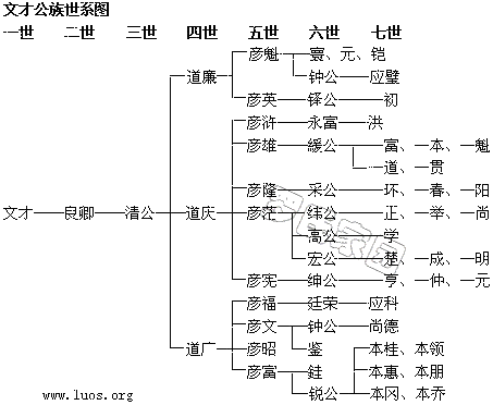 湖北省汉阳府晴川县罗氏文才公系 一 晴川罗氏,系出豫章柏林罗氏,是汉大司农珠公的后裔,睛川开基祖文才公于明朝洪武二年由江西吉水迁居湖北省汉阳府晴川县白池湖,后因地震又迁老泅泾,再因水灾连年,三迁大赤乡罗家榜定居。传至四世道广、道庆、道廉诸公,分三房,长房多居汉川麻河罗家门,刘隔府河口、小罗等地。二房多居麻河镇、龙耳岗,前河、后河,裙带院、罗家台、沔阳南港等地;三房多居六湖院,五半甲、罗家台,五份洲、湾潭,皇恩寺,应城老虎山、罗家湾,云梦玉皇阁等地。现存谱系昭然,历历可考。 文才公实派出豫章、昔有家谱,苦于兵灾残毁,是以世系莫据,代远无传。按旧谱所序自居章公(企生公之父辈)发迹耒阳,越至唐而昭谏公徙居钱塘,后景纶公徙居庐陵,递及宋末之春伯公,仲素公更递及有明之汝芳公,一峰公、整庵、亨信诸公,或居吉安,居永丰,居建昌,居南城,居金陵其间时不一时,地不一地,而其功名显达、文行兼优者,固已代有,伟人历历可指。昔家谱条分缕析、本支详明,愧无所留,幸存者颖公于宋太宗开宝元年所撰《罗氏源流总序》、明成化丙戌状元一峰公所撰<谱序》原文,历代先哲,先贤的画像及像赞十多(祯)篇、本族历代名宦录全集,现选其完整无缺者谨奉《中华罗氏通谱》总部考证载志。晴川罗氏开基祖文才公自明洪武二年入楚至今传二十四世,其后世曾三迁祖祠,四续家谱,丁员昌盛,迁徙频繁,人才辈出,星居各地。有客居外地离宗失粗之宗亲,请借此机会认祖归宗、诚感《通谱》之宗功。 老字派:口惟盂存汝,本文良清道,彦经一应万,大赞士皇宏。 新字派:天相忠信远,淮善宝仁亲,贻谋希亿万,卜世定常新。 志德光先绪,俊贤浩瀚生,千秋昭巨典,毓秀振乾坤。