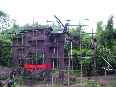 牌坊之争·现场 上百人集体阻挠拆迁牌坊 10月25日,经重庆荣昌县文物部门确认的施工队,来到川渝交界的观音桥牌坊所在地,对有着200多年历史的石牌坊进行拆迁。得知自己祖上所修建的牌坊要被搬迁到重庆荣昌修公园,四川籍罗氏子孙着急了。 一百多名村民赶到了牌坊所在地,要求拆迁队拿出文件,并阻止工人施工。“这可是我们罗家的祖业,怎么说拆就拆了,而且对方一直拿不出文物部门的审批文件。”77岁的罗征扬说。 前日下午,成都商报记者徒步十多里山路来到了观音桥牌坊所在地看到,横七竖八的钢管架在了牌坊四周,将整个牌坊裹着。一块红布包裹着牌坊蹲座中央的塑像,牌坊头部的宝顶已被拆了下来,牌坊左肩的石头被撬松,挪在钢架上,不时有好奇的村民爬上去探看究竟。 牌坊正对一座宽阔的青石板路,矗立在观音桥桥头。由于年久失修,道路和牌坊底部的部分石头被风化,掩映在青山翠竹间。 当天由于一直下雨和现场群众阻挠,参与撤迁的石匠们均放假离开,只剩下2名工人在工棚里看守。 参与拆迁牌坊的石匠李师傅说,25日,公司安排了11个石匠前往观音桥拆牌坊,“石头材质不错,材料很大,拆迁的难度比较大,10多个人起码要拆半个月,今天下雨暂停了。”李师傅称,“据说是搬迁到荣昌县城海棠公园,供游人参观的。” 尽管工期暂停,但牌坊对岸的四川籍罗家子孙时刻关心着拆迁的进度,每天轮流派人前往牌坊守候。