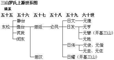 作者:正理http://www.luos.org 广东海丰梅陇三山罗氏,郡望豫章,门出秀川,为清水坑罗氏之分支,以清水开基祖必凤公为始祖。为求发展,必凤公第四子日耀公和嫡侄元攀公(日发次子)迁三山村肇基,衍发为三山罗氏一族。