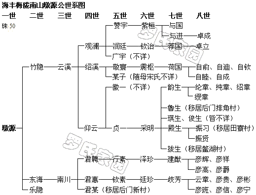 作者:罗传殷http://www.luos.org 溯我祖墩源,妣殷氏,生六子。世代传说:从东莞茶园避乱,一家分两路逃难:母随长子、次子、六子(名失考),不知落居何处?至今未详;父携三子竹隐、四子东海、五子乐隐与一女,于明景泰七(1456)年辗转来到南山(古名石围)定居,迨今已540多年。现属海丰县梅陇镇南山村。位于广汕公路西侧东向。自南山分居本县东澳、田寮、后门、排角及旅居香港等地,估约近5000人口。由于历史原因,不知祖出何系?系出何代?从未查考落实。事遗当代,时逢盛世,受族人支持,寻根问祖。自1991年以来,几访广东、江西、河南三省十六市县,查考同宗诸谱,终据《豫章罗氏大成谱》、《柏林罗氏大成族谱》、《东莞罗氏族谱》续载,始溯豫章罗氏珠公下17世遵生祖支派32世袍公(德成)第七子33世应通公,34世环公子彦瑰(“瓌”通“瑰”),宋乾德二年迁居南雄珠玑巷,35世元祐公,36世文启公,37世纯德公,38世维基公,39世裳公,40世贵公号琴轩,宋绍兴元年领团南迁冈州新会,41世清之公移居番禺车陂,42世鸣公号凤阳,43世维清公,宋末迁横沙。44世元振公,南宋宁宗庆元二年进士,迁居东莞铁冈。其墓志载:“二房映璧裔居墩巷后六世孙一名信卿移居海丰。”45世映璧公,46世千六公,47世君用公,48世伯坚公,49世焕耀公,50世信卿公字墩源,移居海丰。