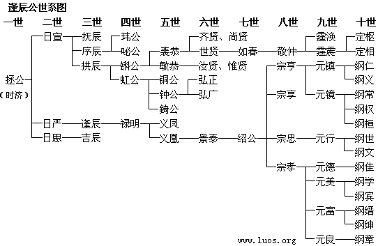 二,汝城逢辰公邦信公系 谱载,始祖拯公,字时济,行中一郎,祖籍襄阳宜城,宋景祜时,因仕官而居江西吉水文昌乡鼓鸣冈,为江西山原一世祖。生子三,日宣、日严、日思。 日思,字九德,行三郎,由吉水徙永丰,转徙吉水,生子一,吉辰。字良期。 日严,字六德,行二郎,由吉水迁赣州,生子一,逢辰。字福善。原分迁赣州,见汝城山川秀,遂迁居汝城文明寒田,再迁圹下(秀山),为始迁祖。 日宣,字三德,行一郎,太博彭齐公讳其才器,以女妻之,而迁居白珏之完圹,生子三,抚辰、序辰、拱辰。拱辰,字纬,行三郎,由完圹迁螺陂枫山,生子二,蚪、虹。蚪,字仲晦,行一郎,居螺陂枫山,生子二,裴恭、敏恭。裴恭,字钦若,行十八郎,号不欺先生,由螺陂枫山迁山原,生子三,齐贤、尚贤、世贤。世贤,字子绍,行念五郎,居山原,生子一,如春。如春生子一,敬仲。敬仲生子二,霆涣、霆震。霆震字云翁,行九一郎,生子二,定枢、定相。定相生子一,邦信(少八十七郎)。邦信由山原迁居文明寒田,再迁东山、东冲水,为东山始迁祖。 逢辰公迁居至今已三十五世;邦信公迁居至今已二十九世。逢辰公系现有人口含资兴部份共2400余人。 旧班序诗四句二十八世: