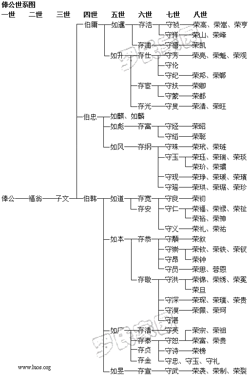 一,汝城县文明司俸公系 谱载,珠公五十一世俸公,祖籍江西吉安府吉水县阜田镇熂下村,于元顺帝至正十二年(1352)任广东连州刺史解组归途中,路经汝城文明司,见山川秀丽,物产丰饶,回家后与兄仪公商妥,相偕迁居文明司,为一世始迁祖。并因此地“文经武纬,山明水秀”而以“文明”二字以名之。 俸公生子,福翁;福翁生子,子文;子文生子三,长子伯墉,定居西封:次子伯忠,定居东冲村,老屋村;三子伯韩,其长子定居司背弯;次子定居库塘丘;后二人又再移居城下;子孙散居桐江冲、赤坑、长岐、竹下等地。自俸公迁居至今六百余年间,三大房裔孙派衍6000余众,分布于湘、粤、赣、川各省,为汝城望族。 “罗氏家庙”建于清乾隆五十年间,为珠公六十六世嘉梅公偶建。修谱,《罗氏续修谱序》(第七届)云:“自宋淳熙以来,历元而明、而清,经四朝之先公大人迭次编辑,几于无美不臻,尚复何事而俟。”到民国二十四年,又再续修族谱。